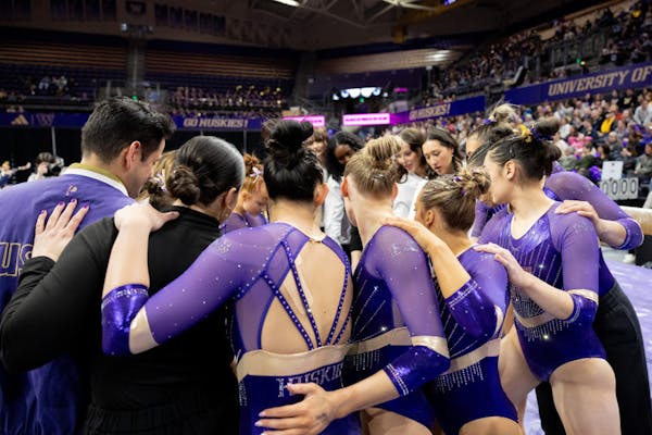 300926bc0edd6174e8dc1458ac50919d.jpg Washington team members huddle up during their meet against Michigan on Jan. 25, 2025 at Alaska Airlines Arena in Seattle, Wash.