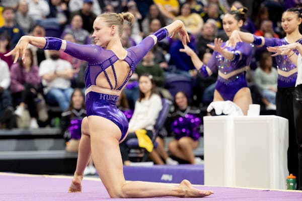 31e964a443a7a6fc6d17adf0f42c76af.jpg Graduate student Taylor Russon performs on the floor during Washington's meet against Michigan on Jan. 25, 2025 at Alaska Airlines Arena in Seattle, Wash.