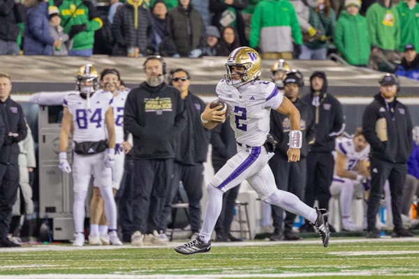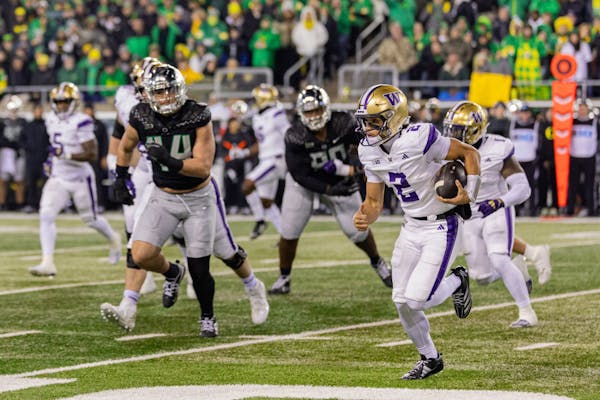 f788e3ee221f88a652764e14d900db70.jpg Washington quarterback Demond Williams Jr. scrambled with the football against the #1 ranked Oregon Ducks at Autzen Stadium in Eugene, Oregon on Nov. 30th, 2024.
