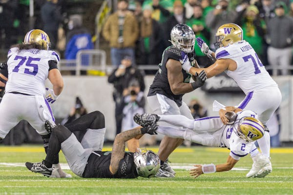 e0131b8949f21c6a88990b5e61873b29.jpg Washington quarterback Demond Williams Jr. gets sacked against the #1 ranked Oregon Ducks at Autzen Stadium in Eugene, Oregon on Nov. 30th, 2024.