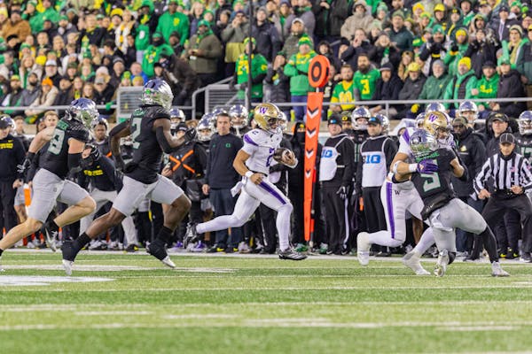 1a8e309377f97635144f87b5d3a83f0e.jpg Washington quarterback Demond WIlliams Jr. scrambles with the football against the #1 ranked Oregon Ducks at Autzen Stadium in Eugene, Oregon on Nov. 30th, 2024.