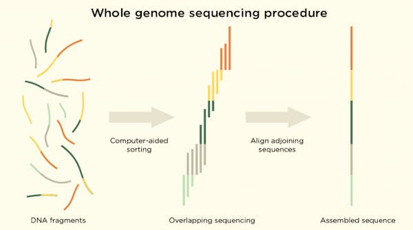 001ff96f4d68ffe4a77681f141b8842b.png Scientists can recreate a person's whole genetic material by aligning all the short fragments of DNA sequence data that overlap one another. The final sequence can be used by researchers to find disorders or other irregularities, which can then be used by doctors and clinicians to provide health care accordingly.