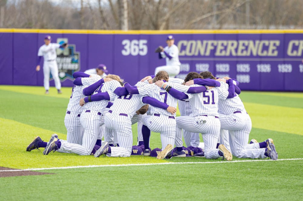 Washington baseball team huddles before their game against Pacific Lutheran University at Husky Ballpark on March 18th, 2025.