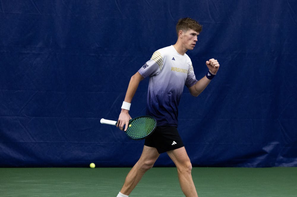 Senior Dzianis Zharyn celebrates winning a point during the Washington men's tennis match against Ohio State at Nordstrom Tennis Center in Seattle, Washington on March 16, 2025.