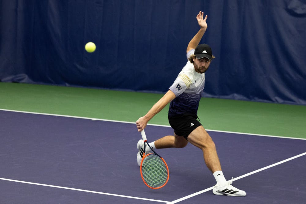 Senior Nedim Suko slides to hit the ball during the Washington men's tennis match against Ohio State at Nordstrom Tennis Center in Seattle, Washington on March 16, 2025.