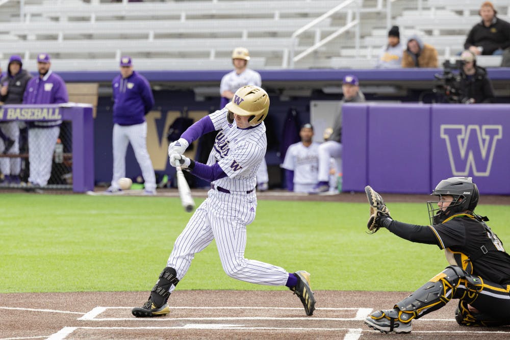 Washington catcher Colin Blanchard attempts to hit the baseball against PLU at Husky Ballpark on March 18th, 2025.