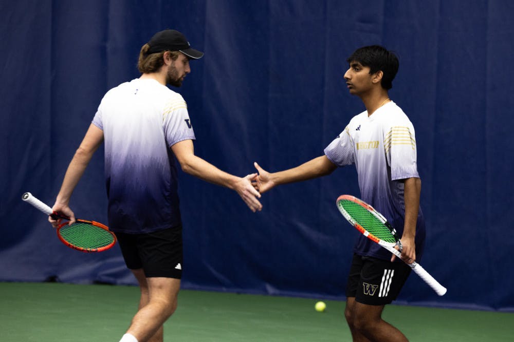 Senior Nedim Suko high-fives his doubles teammate, sophomore Soham Purohit, after winning a point during the Washington men's tennis match against Ohio State at Nordstrom Tennis Center in Seattle, Washington on March 16, 2025.