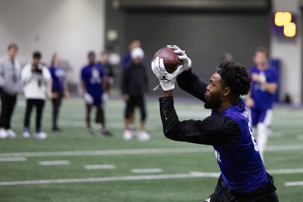 Senior wide receiver Jeremiah Hunter catches a pass during Washington's Pro Day at Dempsey Indoor Center in Seattle, Washington on March 10, 2025.