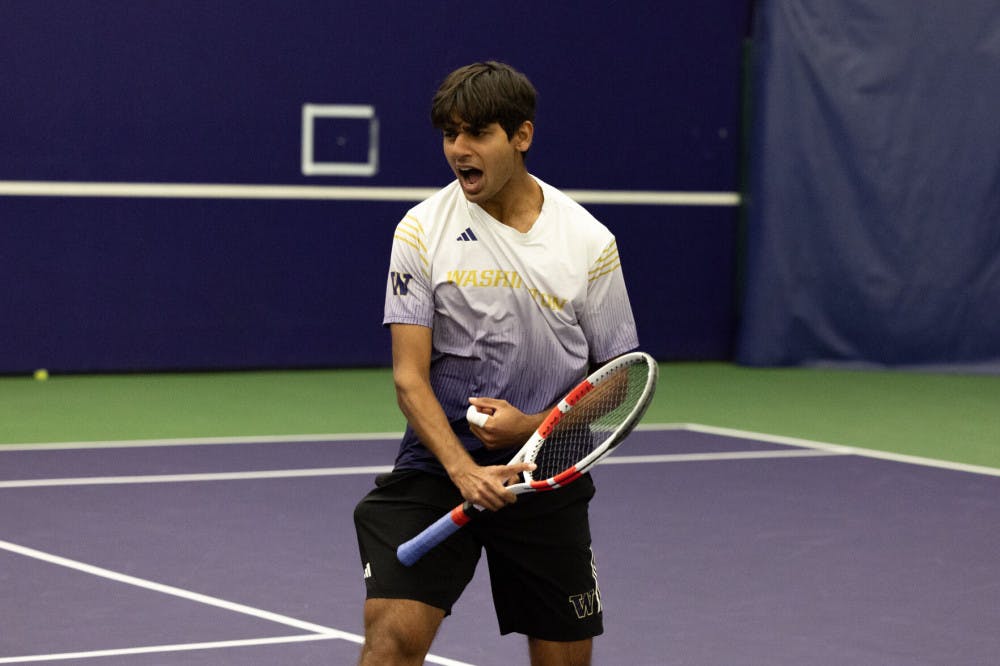 Freshman Rohan Belday celebrates winning a set during the Washington men's tennis match against Ohio State at Nordstrom Tennis Center in Seattle, Washington on March 16, 2025.