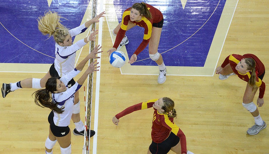 The Huskies used 19 blcoks Friday night to take down No. 4 USC and win thier 13th consecutive match.