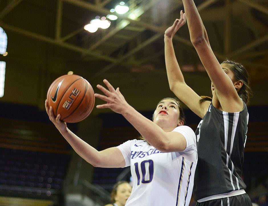 Guard Kelsey Plum tries to shoot around Washington State's Lia Galdeira in Washington's 85-76 loss to WSU. Plum socred a career-high 30 points in the loss.