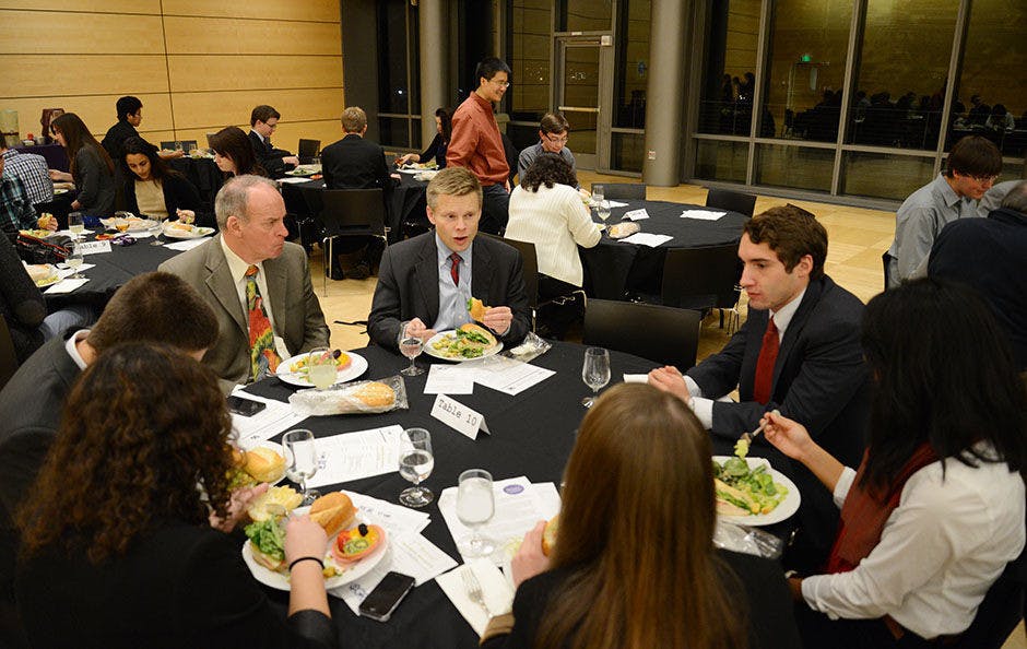 State representatives Jamie Pedersen and Jake Fey speak with students during the Seventh Annual Legislative Reception on Monday night.