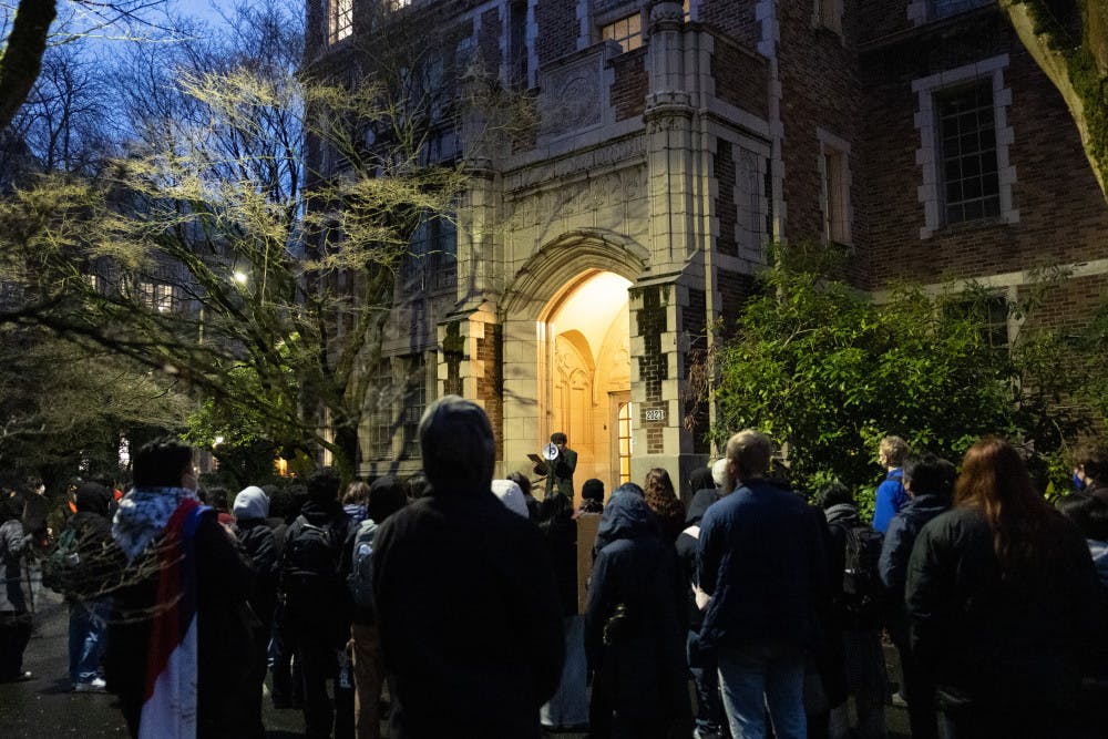 A speaker addresses the crowd at the "Ice Off UW Campus" SDS rally at Thomson Hall Feb. 6, 2025 in Seattle.