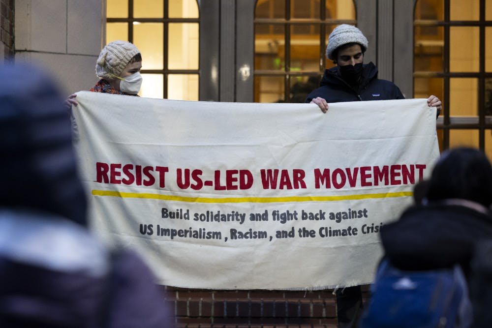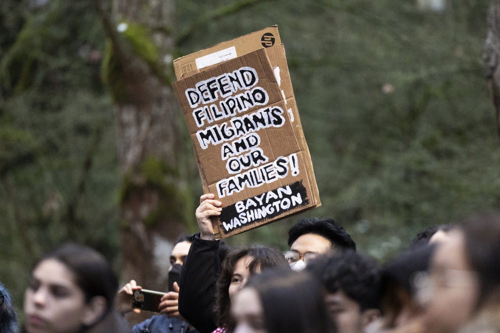 Students hold up banner during UWSDS ICE-off UW Campus protest outside of Thomson Hall on February 6, 2025.