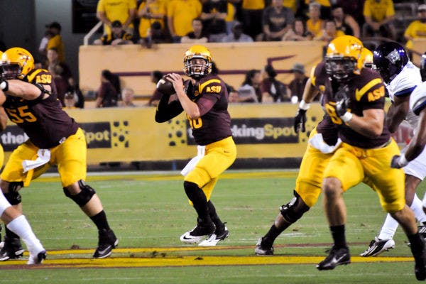 Redshirt senior quarterback Taylor Kelly looks for a receiver during the game against Weber State on Aug. 28. ASU defeated Weber State 45-14 at Sun Devil Stadium in Tempe.