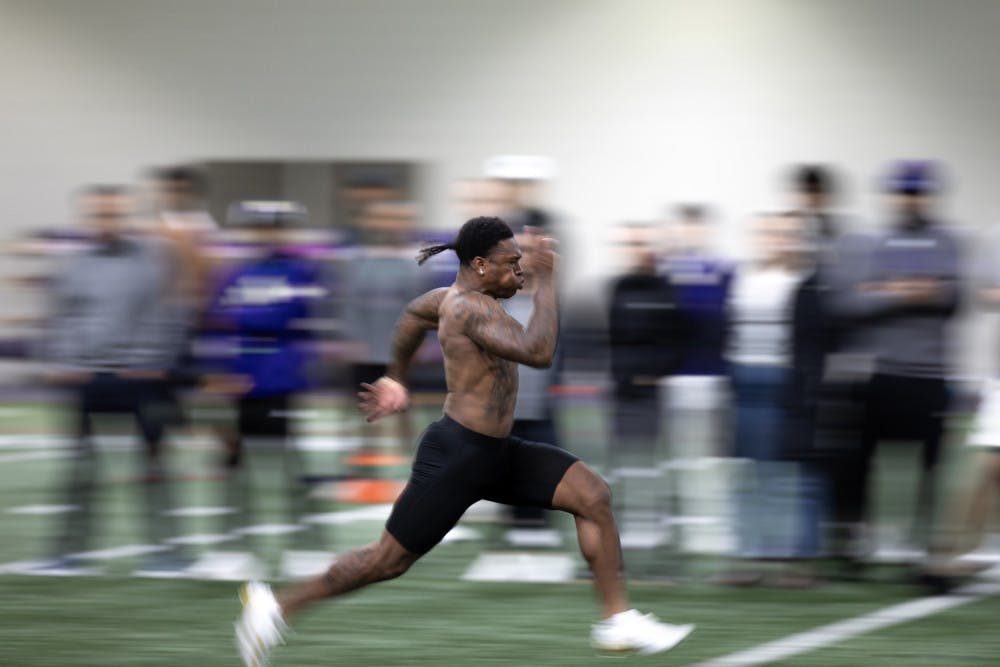 Senior wide receiver Giles Jackson sprints the 40-yard dash during Washington's Pro Day at Dempsey Indoor Center in Seattle, Washington on March 10, 2025.