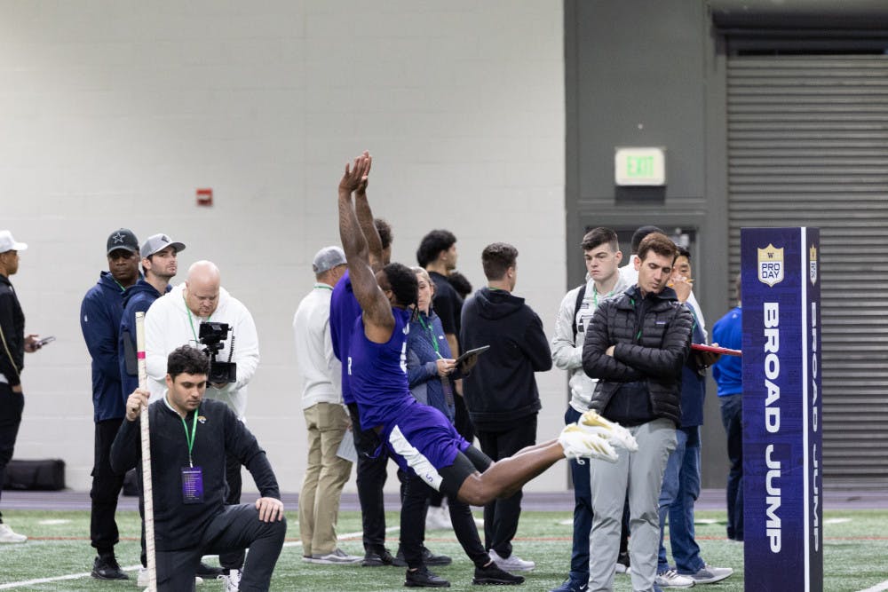 Senior wide receiver Giles Jackson completes his broad jump test during Washington's Pro Day at Dempsey Indoor Center in Seattle, Washington on March 10, 2025.