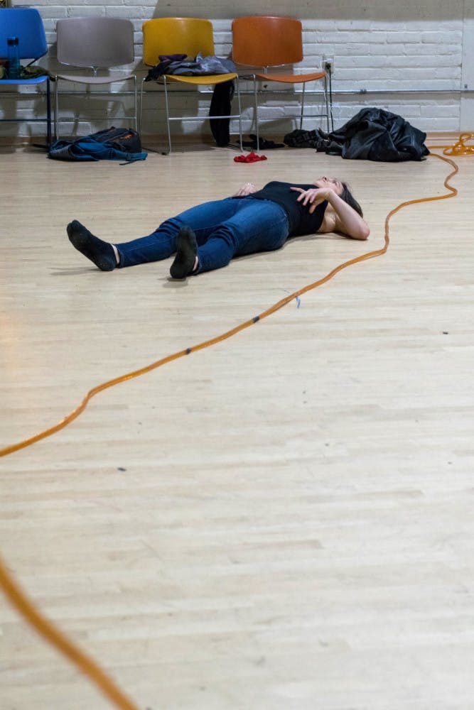 Actress Alicia Crowley does a physical warmup in preparation for a run of "Untitled Perversion No. 3".