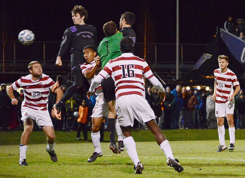 Ian Lange (top left) heads in the game-winning goal against Stanford on Sunday to send the Huskies to the Elite Eight for the first time in program history.
