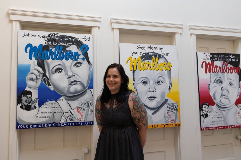 The owner of the Sockshop University, Sarah Gil, with her work in the gallery at the back of the shop.