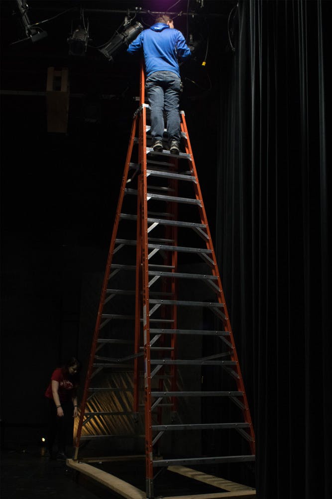 Michael Dugan focuses a light with Sam Jones.