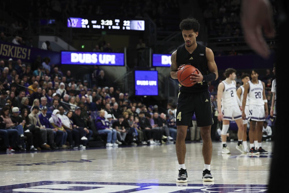 Senior guard DJ Davis prepares for a free throw during Washington's game against Northwestern on Feb. 8, 2025, in Seattle.