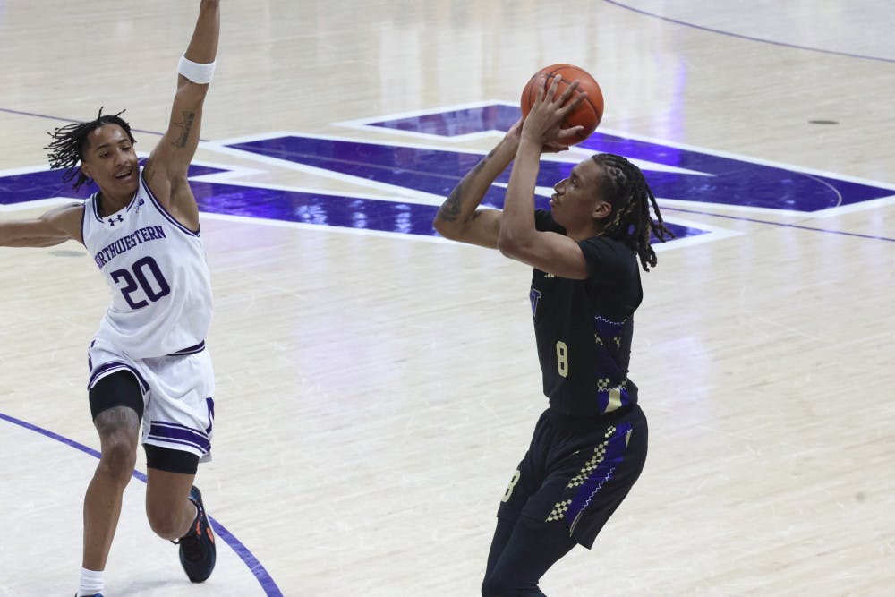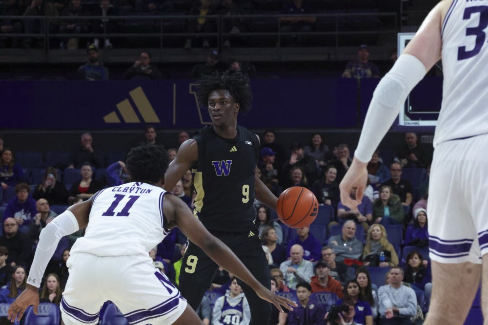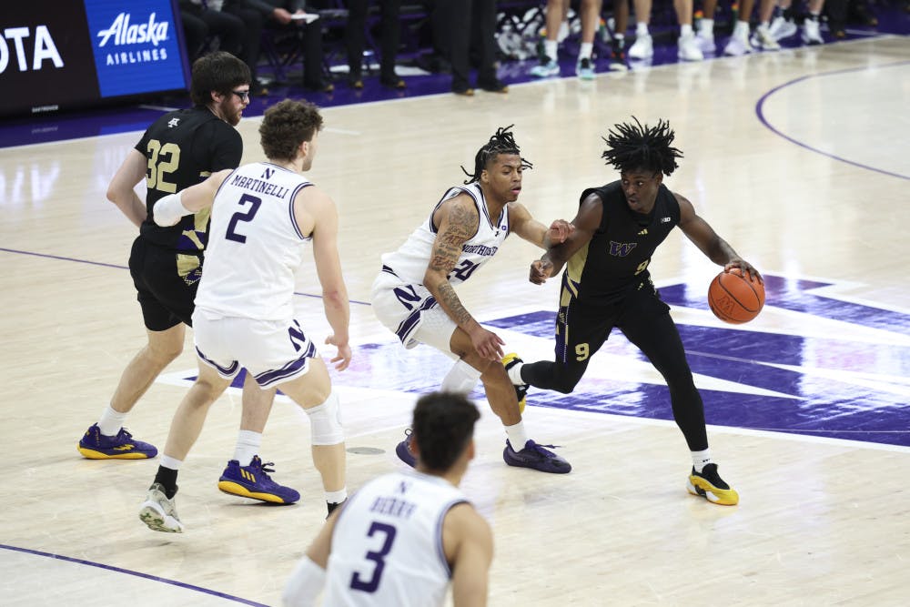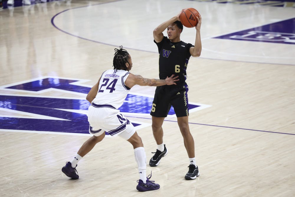 Guard Mekhi Mason passes the ball to the corner during UW's game against Northwestern on Feb. 8, 2025 at Alaska Airlines Arena in Seattle.