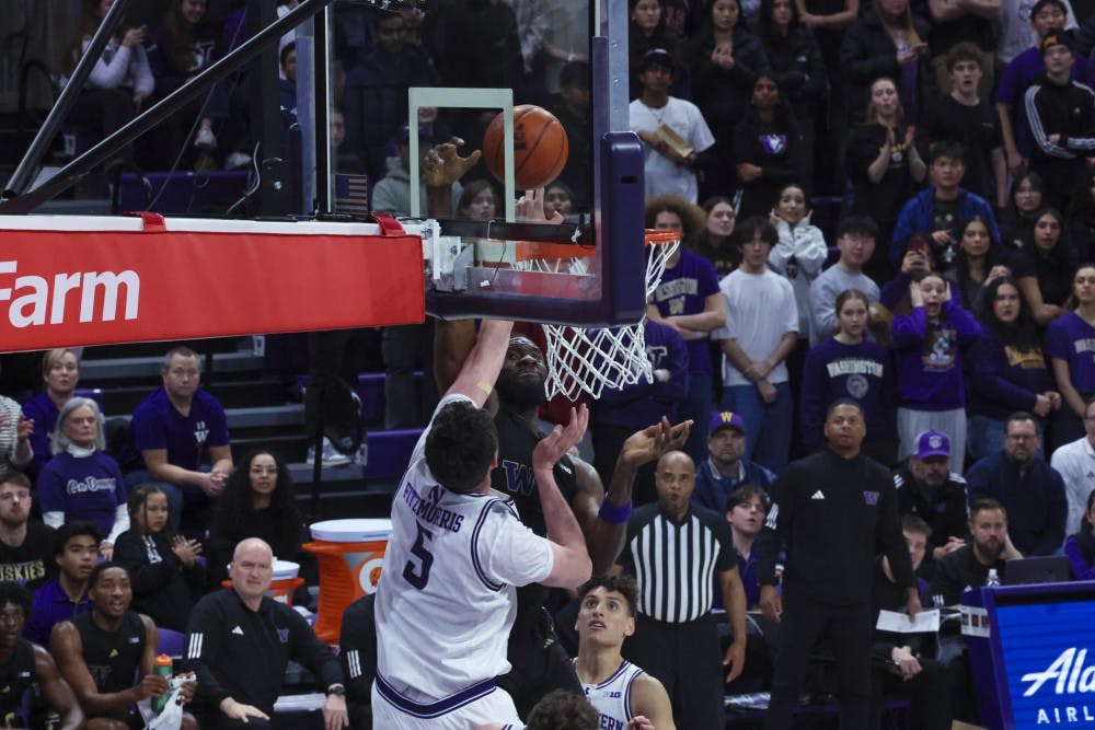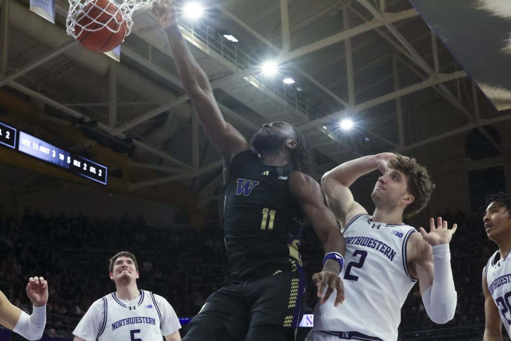 Center Franck Kepnang dunks the ball during UW's game against Northwestern on Feb. 8, 2025 at Alaska Airlines Arena in Seattle.