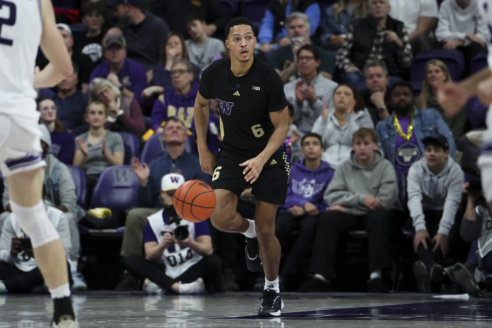 Guard Mekhi Mason prepares for the next play during UW's game against Northwestern on Feb. 8, 2025 at Alaska Airlines Arena in Seattle.