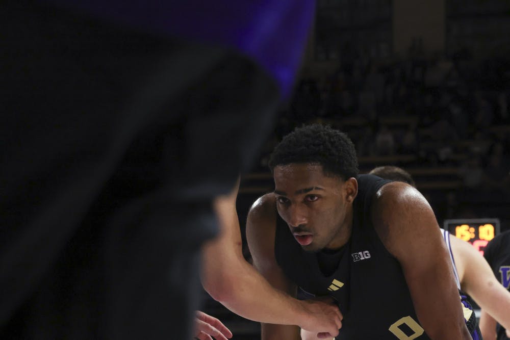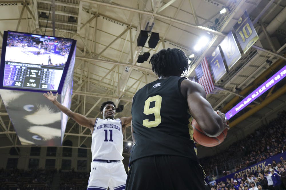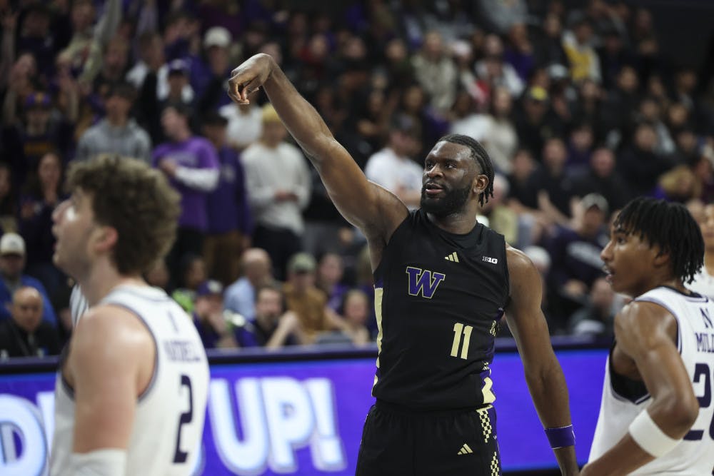 Graduate center Franck Kepnang watches the ball during Washington's game against Northwestern on Feb. 8, 2025, in Seattle.