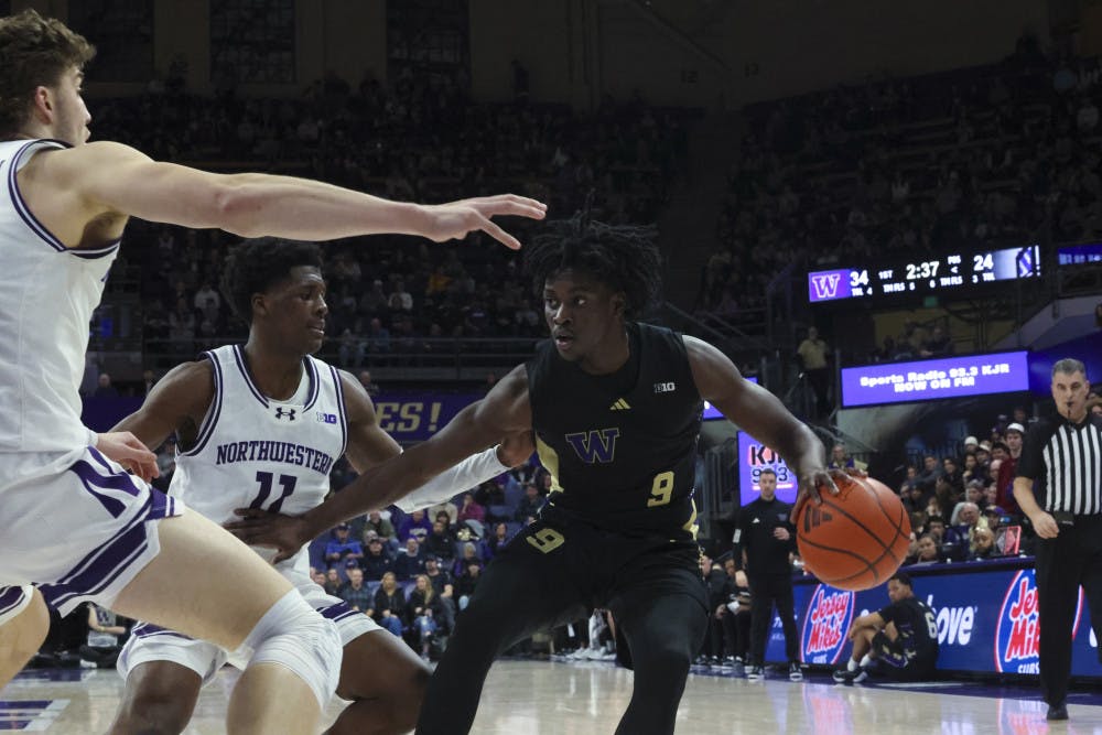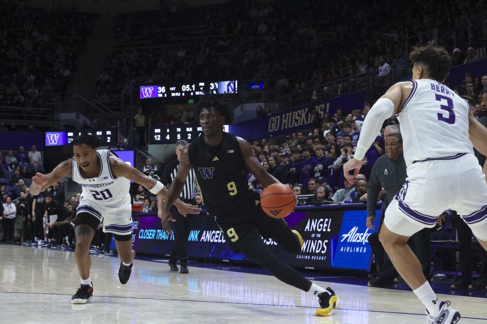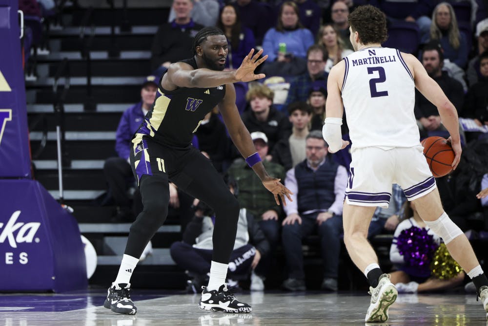 Guard Vazoumana Diallo creates space from the defense during UW's game against Northwestern on Feb. 8, 2025 at Alaska Airlines Arena in Seattle.