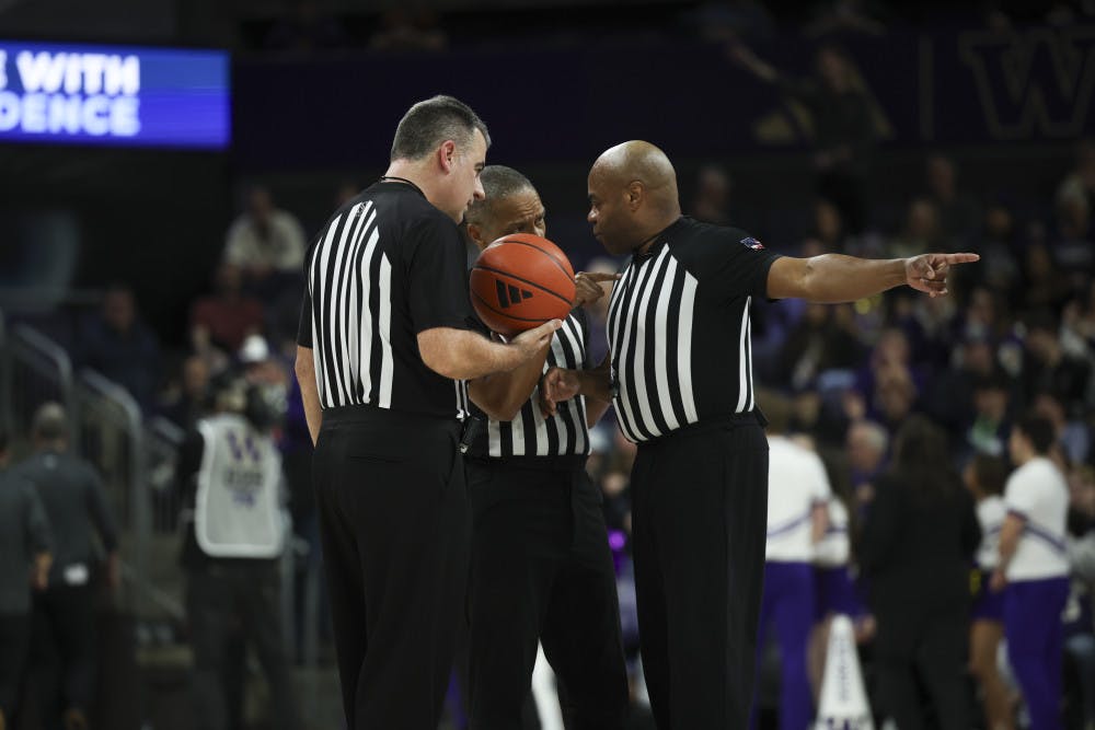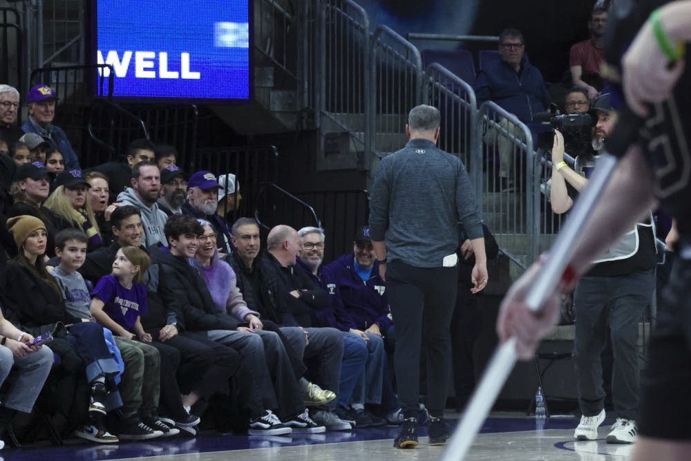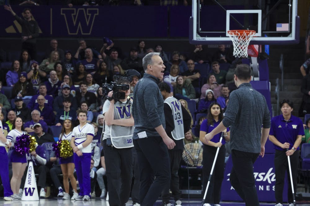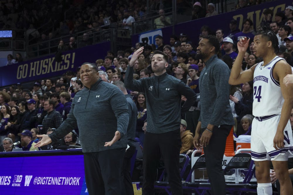 Referees place two technical fouls on Northwestern head coach Chris Collins during the first half of Washington's game against Northwestern on Feb. 8, 2025, in Seattle. Collins was ejected for the rest of the game.