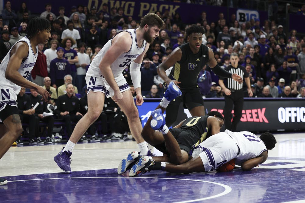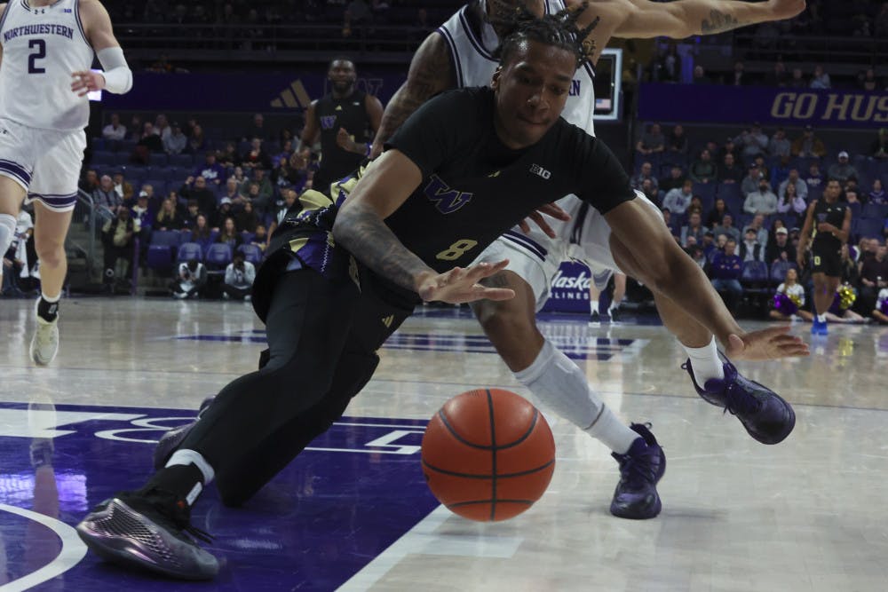 Guard Tyler Harris scrambles for a loose ball during UW's game against Northwestern on Feb. 8, 2025 at Alaska Airlines Arena in Seattle.