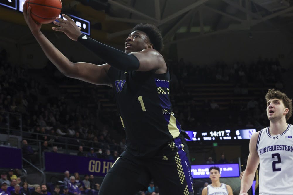 Center Franck Kepnang leaps into the air to make the basket during UW's game against Northwestern on Feb. 8, 2025 at Alaska Airlines Arena in Seattle.