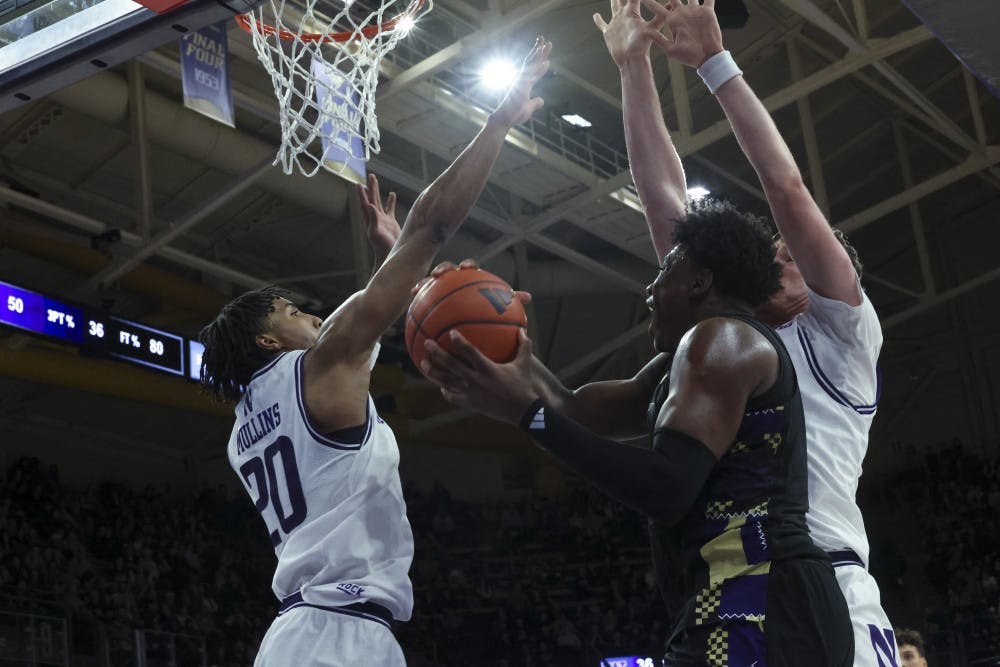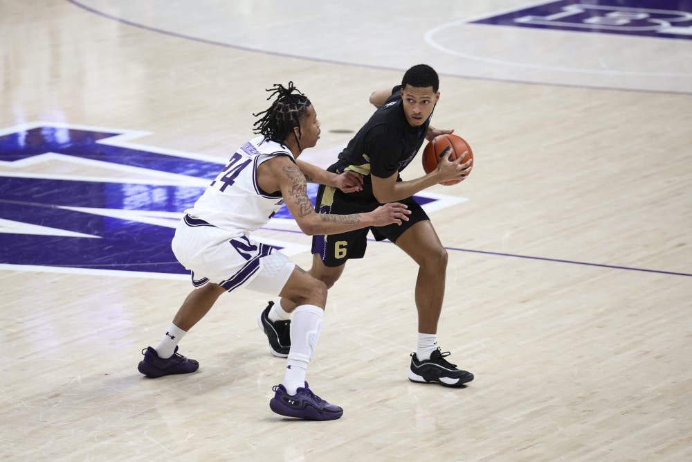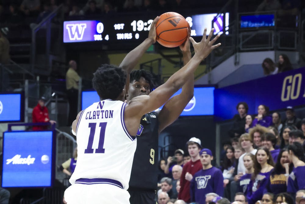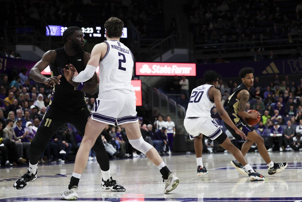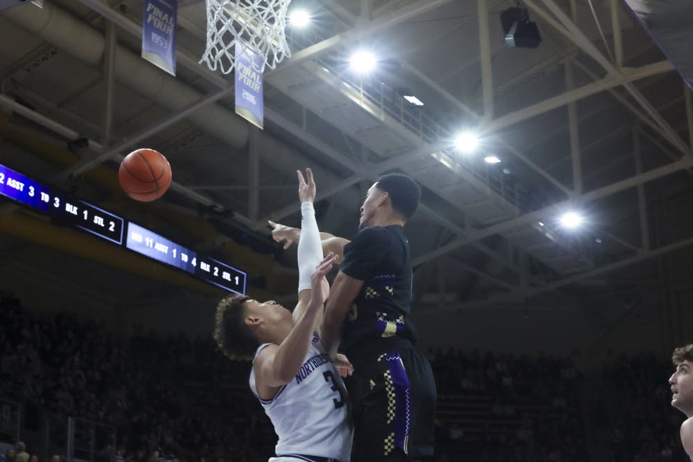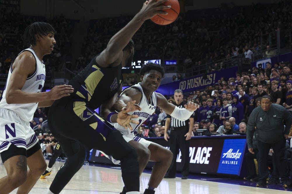 Senior forward Great Osobor watches as junior guard Mekhi Mason dives for the ball during Washington's game against Northwestern on Feb. 8, 2025, in Seattle.