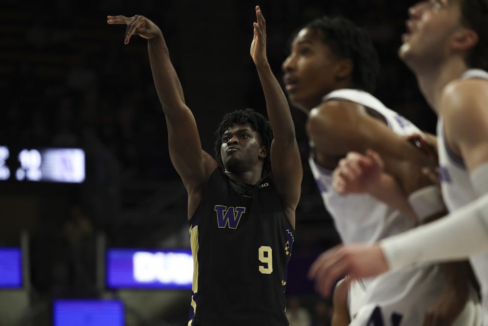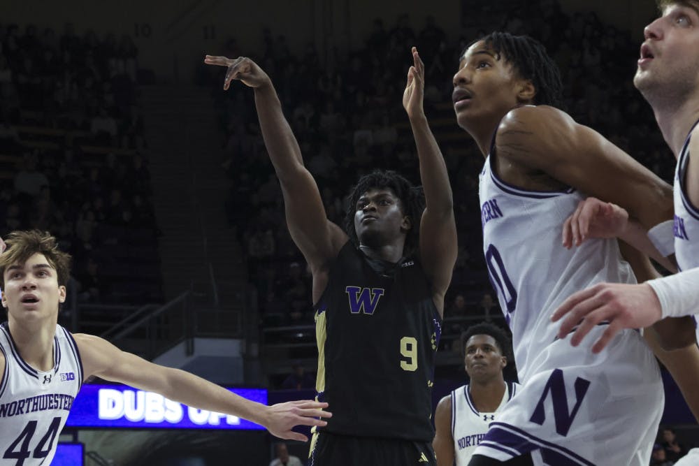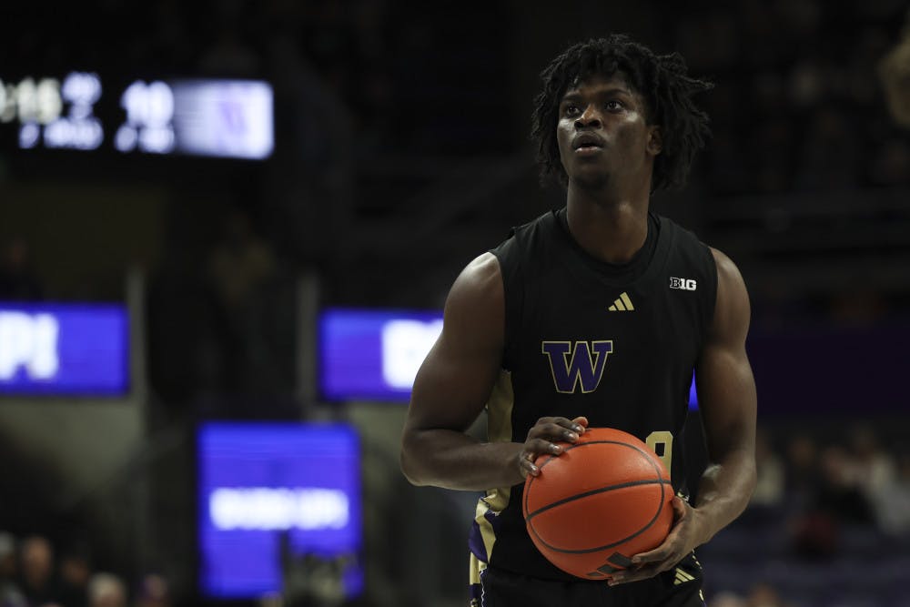 Freshman guard Vazoumana Diallo prepares for a free throw during Washington's game against Northwestern on Feb. 8, 2025, in Seattle.