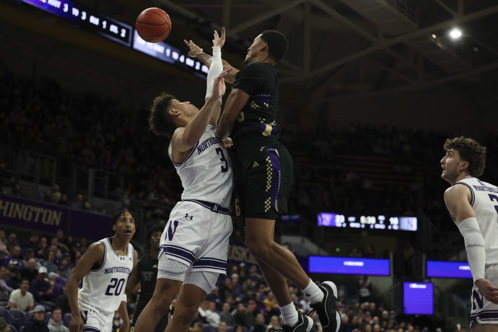 Senior guard Tyree Ihenacho jumps for the ball during Washington's game against Northwestern on Feb. 8, 2025, in Seattle.