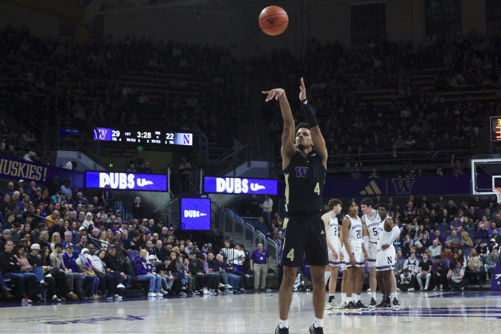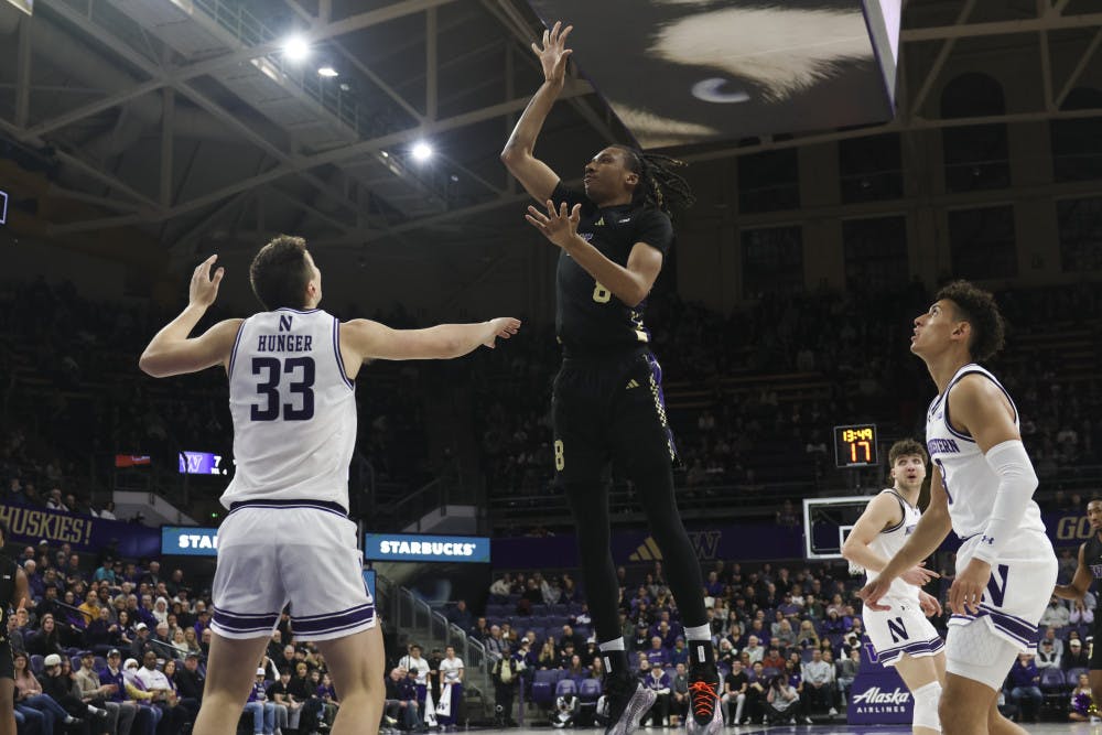 Guard Tyler Harris shoots a three pointer during UW's game against Northwestern on Feb. 8, 2025 at Alaska Airlines Arena in Seattle.