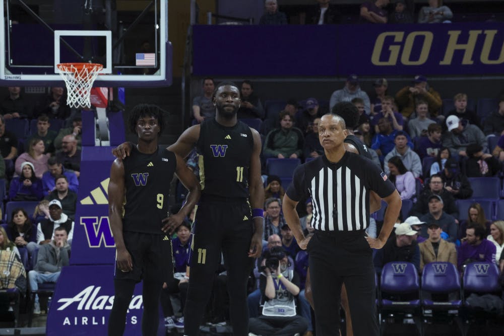Guard Vazoumana Diallo and center Franck Kepnang stand together, waiting for the game to resume, during UW's game against Northwestern on Feb. 8, 2025 at Alaska Airlines Arena in Seattle.