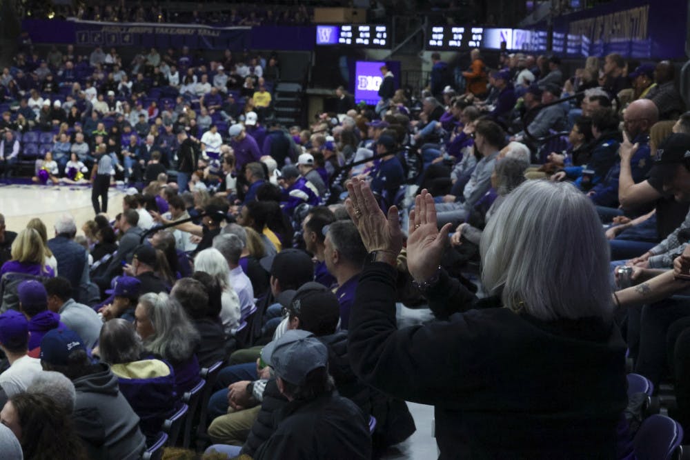 Husky fans cheer for their favorite players during UW's game against Northwestern on Feb. 8, 2025 at Alaska Airlines Arena in Seattle.