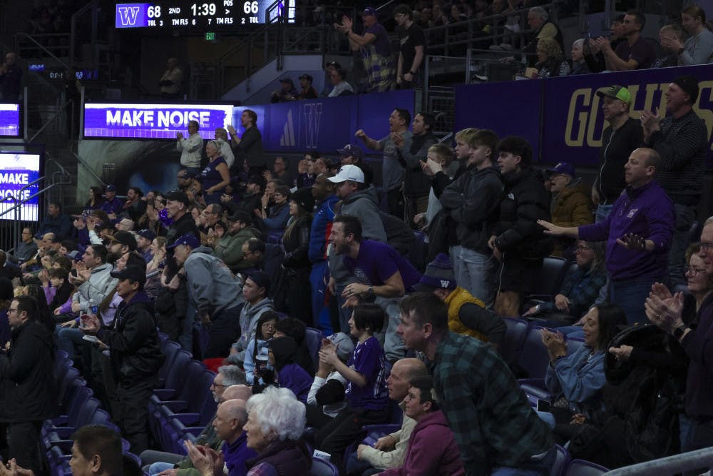 Crowd celebrates Washington's point during their game against Northwestern on Feb. 8, 2025, in Seattle.