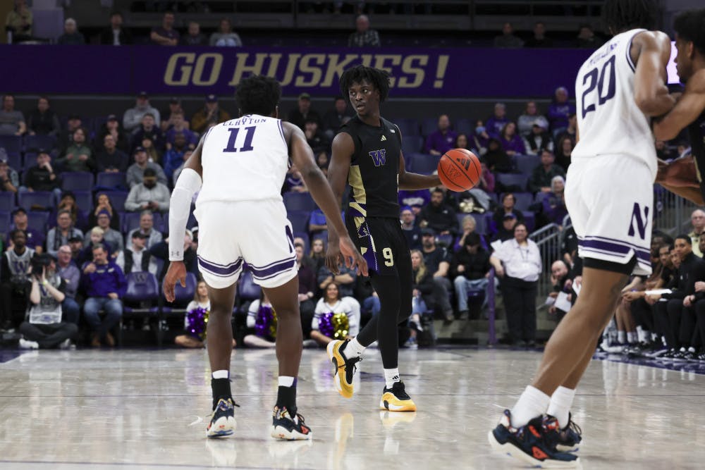 Guard Vazoumana Diallo scans the court during UW's game against Northwestern on Feb. 8, 2025 at Alaska Airlines Arena in Seattle.