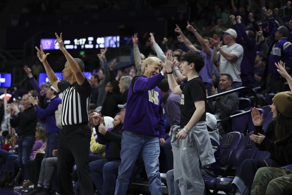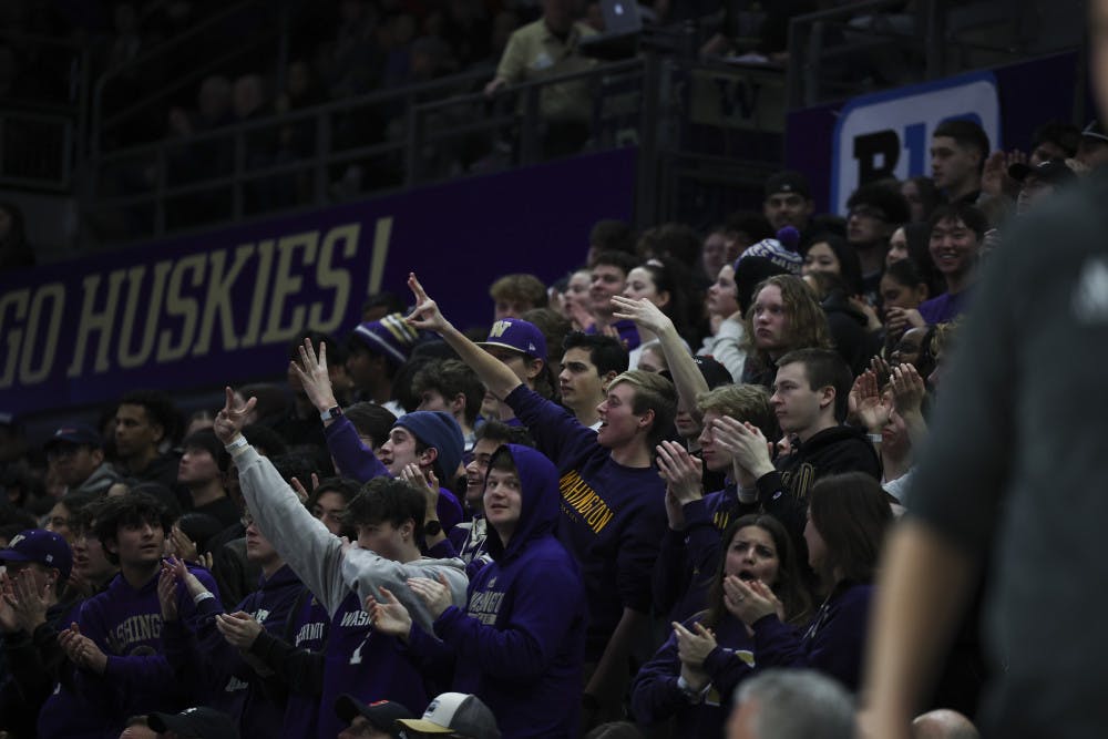 Crowd celebrates Washington's 3-point play during their game against Northwestern on Feb. 8, 2025, in Seattle.