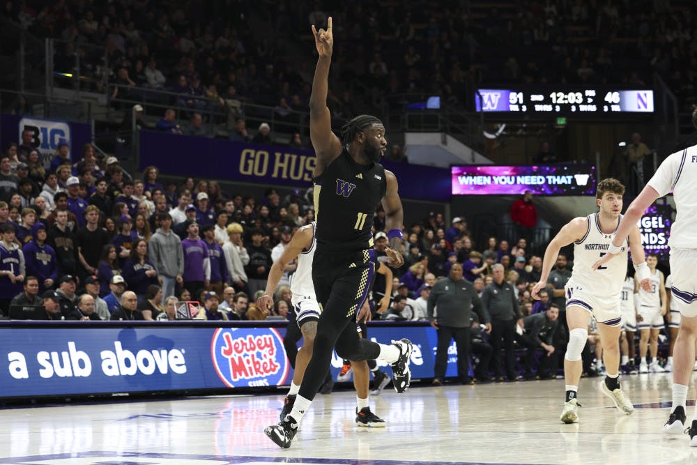 Center Franck Kepnang celebrates a lay in during UW's game against Northwestern on Feb. 8, 2025 at Alaska Airlines Arena in Seattle.