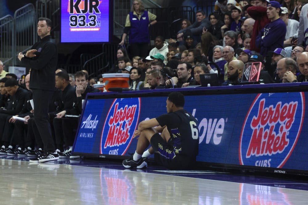 Center Franck Kepnang stands in shock after Northwestern's head coach, Chris Collins, gets ejected from UW's game against Northwestern on Feb. 8, 2025 at Alaska Airlines Arena in Seattle.