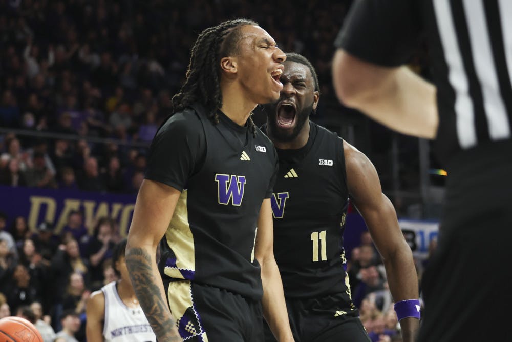 Sophormore guard Tyler Harris and graduate center Franck Kepnang celebrate during Washington's game against Northwestern on Feb. 8, 2025, in Seattle.