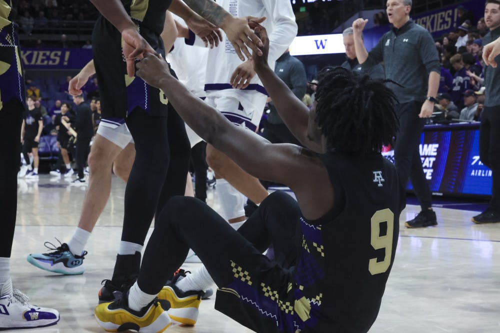 Teammates help guard Vazoumana Diallo up from the ground during UW's game against Northwestern on Feb. 8, 2025 at Alaska Airlines Arena in Seattle.