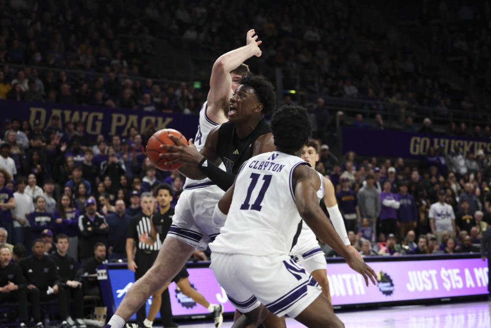 Guard DJ Davis loops the ball into the hoop during UW's game against Northwestern on Feb. 8, 2025 at Alaska Airlines Arena in Seattle.