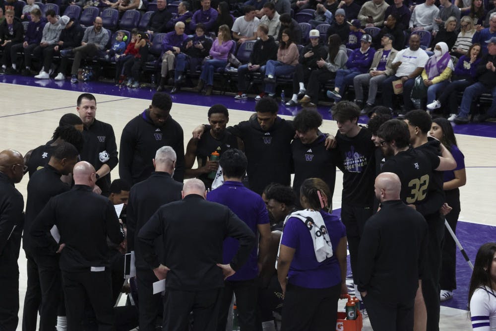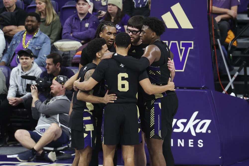 The UW men's basketball team huddles together for a timeout during UW's game against Northwestern on Feb. 8, 2025 at Alaska Airlines Arena in Seattle.