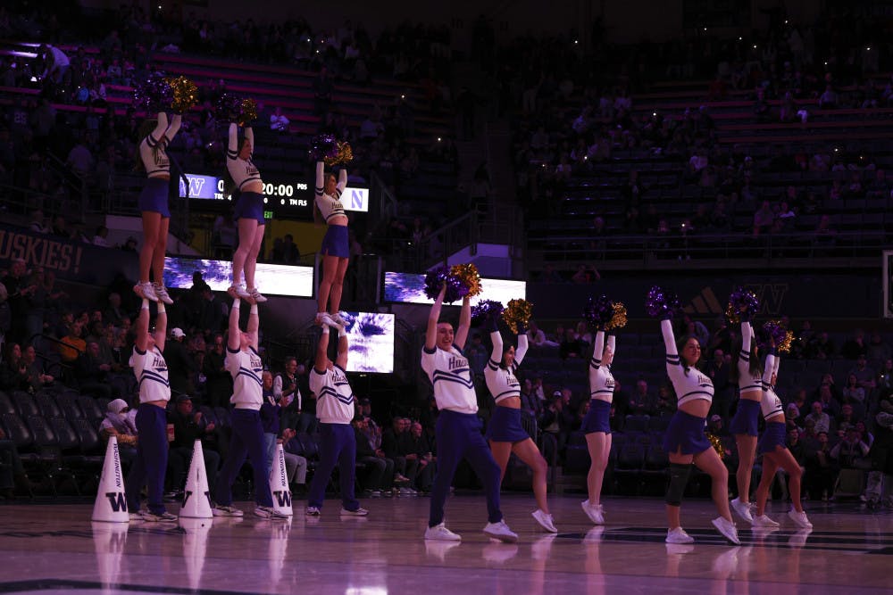 UW Spirit peforms before the start of Washington's game against Northwestern on Feb. 8, 2025, in Seattle.